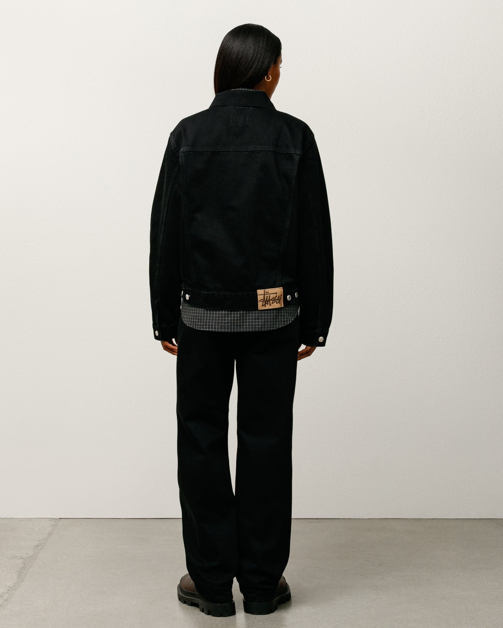 • Boxy cut with branded nickel shank hardware, gold topstitching and a suede Stüssy logo patch